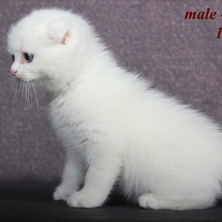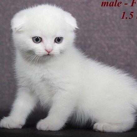 Foxtrot purebred Scottish fold shorthair male kitten in a white color. Was born on November 14th, 2025.  Available for reserve, pick up after February 13th. Delivery to other states is available.