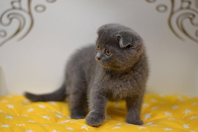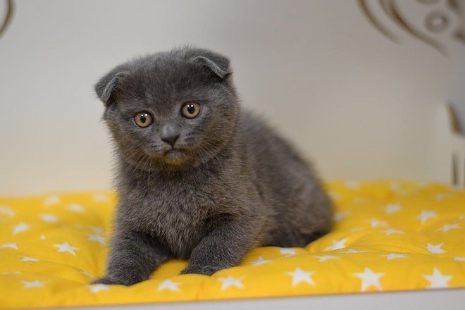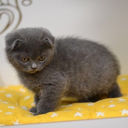 John purebred Scottish fold male kitten, in a dark blue color. Was born on November 22nd, 2025. Available for reserve, pick up after March 25th. Delivery to other states is available.