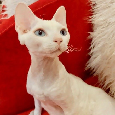 Marlboro purebred, male Devon Rex kitten, white color with blue eyes. Was born on June 17th, 2024. Available for reserve, pick up after January 31st. Delivery to other states is available.