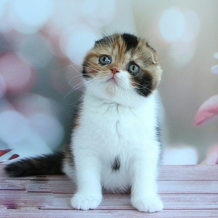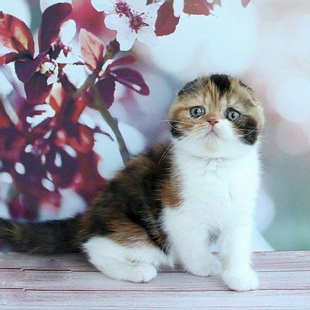 Omnika in a tortoiseshell bicolour color purebred Scottish fold shorthair kitten