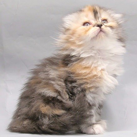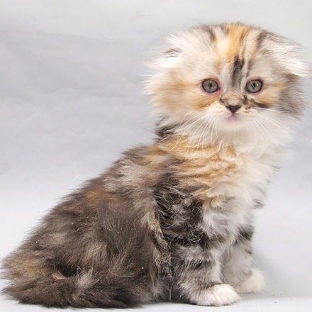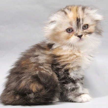 Queen Victoria in a tortoiseshell silver marble bicolor color purebred Scottish fold longhair kitten